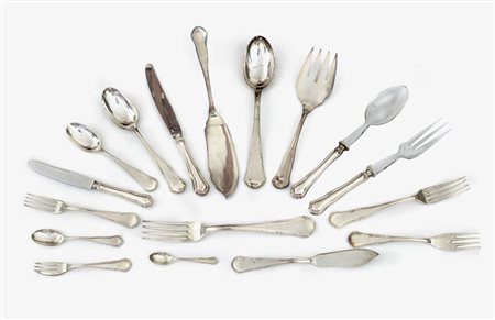 SERVIZIO DI POSATE IN ARGENTO, XX SECOLO, composto da dodici forchette, cucchiai e coltelli, dodici forchette e coltelli da pesce, dodici forchette, cucchiai e coltelli da frutta, dodici forchettine da dessert, dodici cucchiaini da tè, sei da caffé e sei posate da portata (tot. pz. 132).