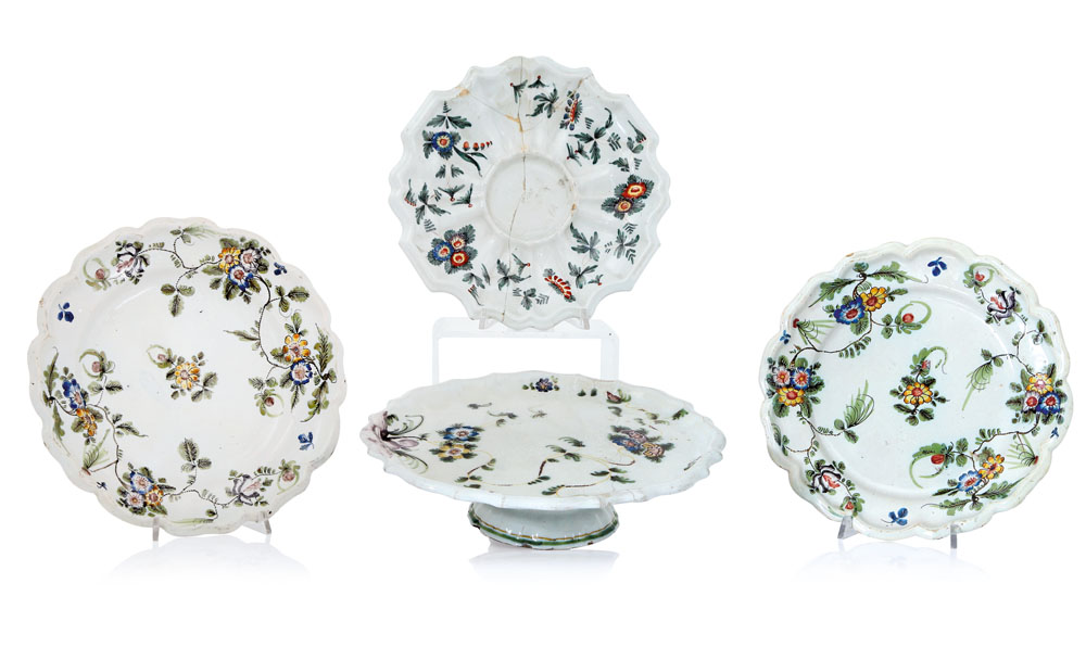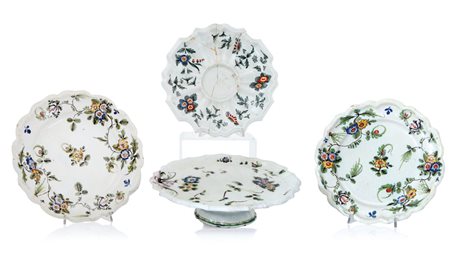 FAENZA COPPIA DI PIATTI, UNA ALZATA E UN SOTTO TAZZA IN MAIOLICA, XVIII...