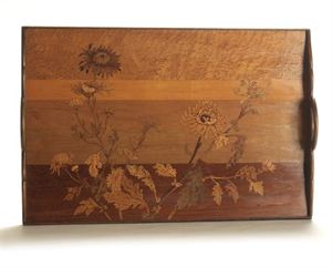 GALLE' EMILE Nancy 1846 - 1904 Vassoio con sei essenze di legni vari, decoro...