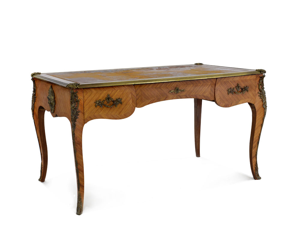 BUREAU PLAT DA CENTRO IMPIALLACCIATO IN LEGNI VARI, XIX SECOLO, in stile settecentesco con piano rivestito in pelle e cassetti alla fascia, gambe mosse e applicazioni in bronzo; usure e sbeccature.