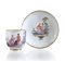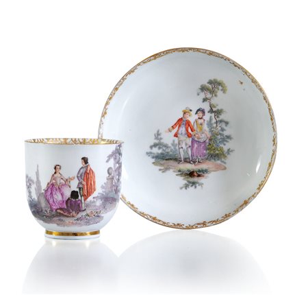 TAZZA CON PIATTO IN PORCELLANA, MEISSEN, 1750 CA., decoro con scene galanti alla "Watteau" policrome, profilo in oro.