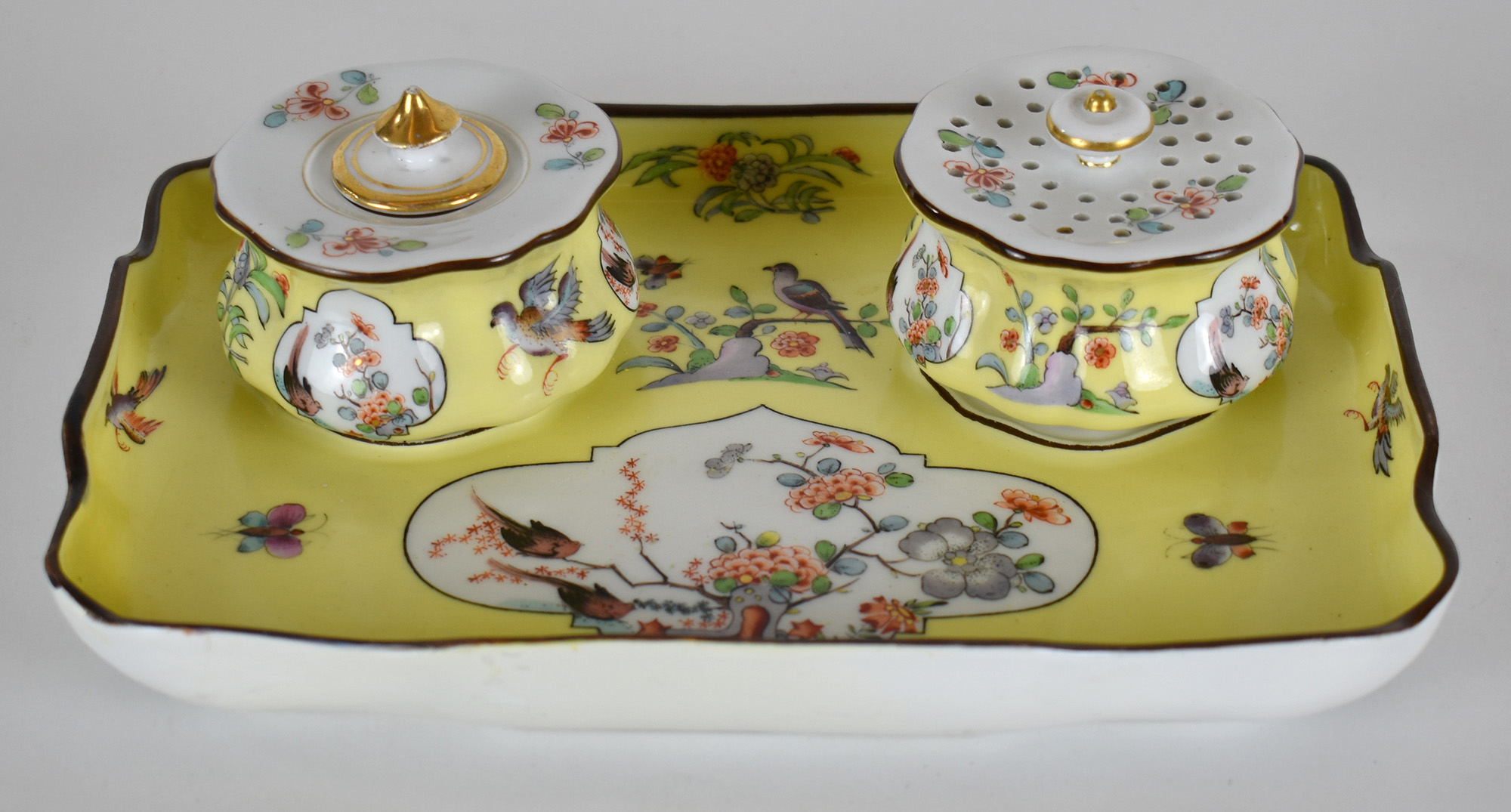 Calamaio in porcellana dipinta con motivi floreali e volatili marcato sul fondo con spade blu incrociate