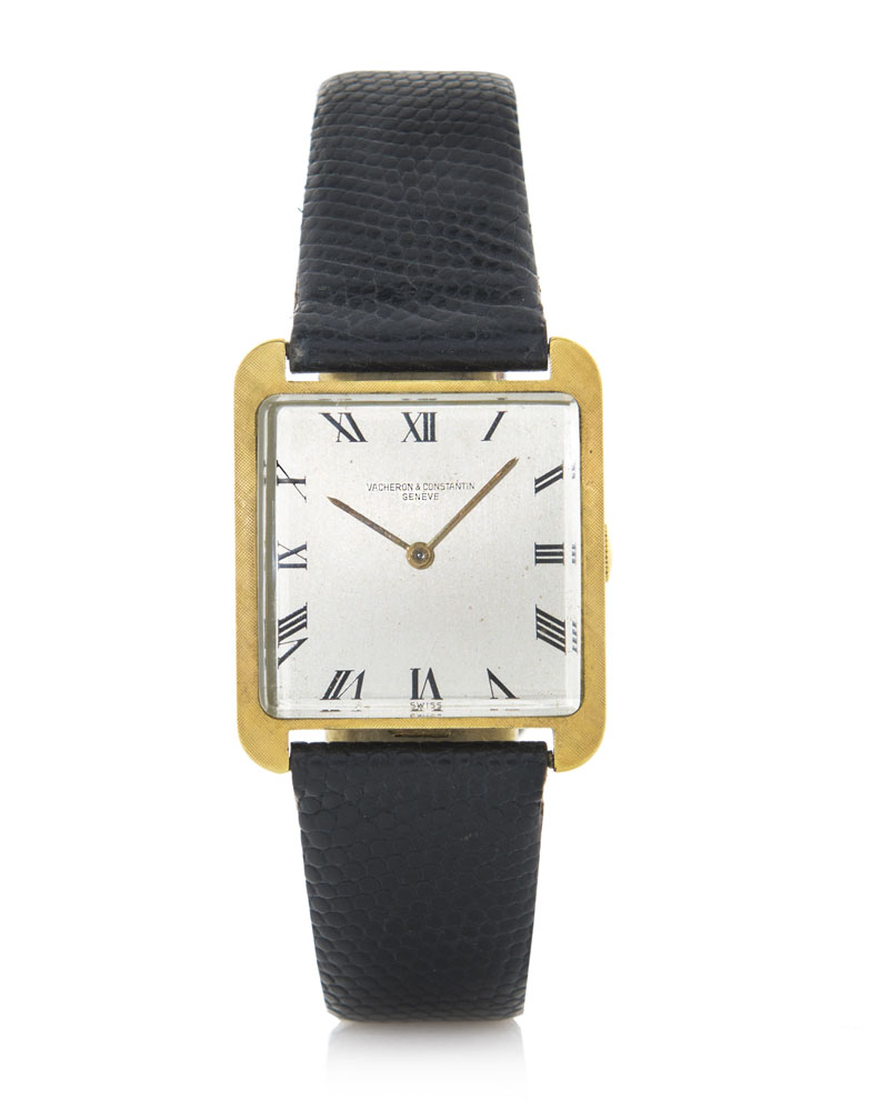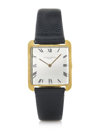 Cassa n. 404647 carré galbé in oro giallo 18 kt satinata. Quadrante argentato con numeri romani smaltati. Movimento a carica manuale. Quadrante, cassa e movimento firmati.