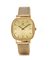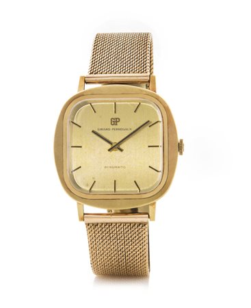 Cassa n. 30085 carré galbé in oro giallo 18 kt. Quadrante champagne con indici applicati. Movimento a carica automatica. Bracciale in oro giallo 18 kt. Quadrante, cassa e movimento firmati.