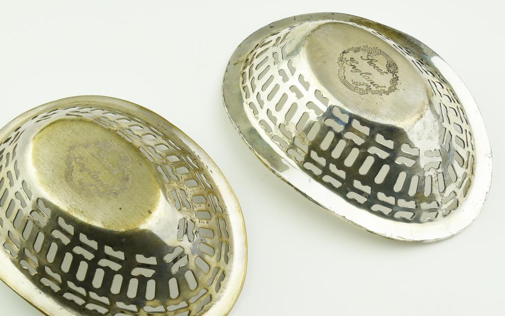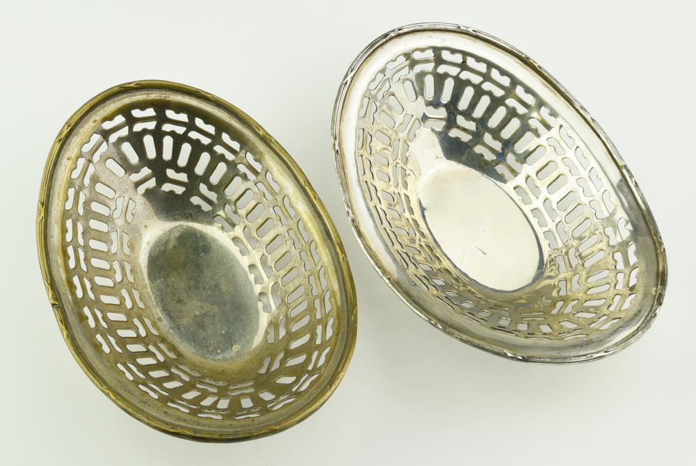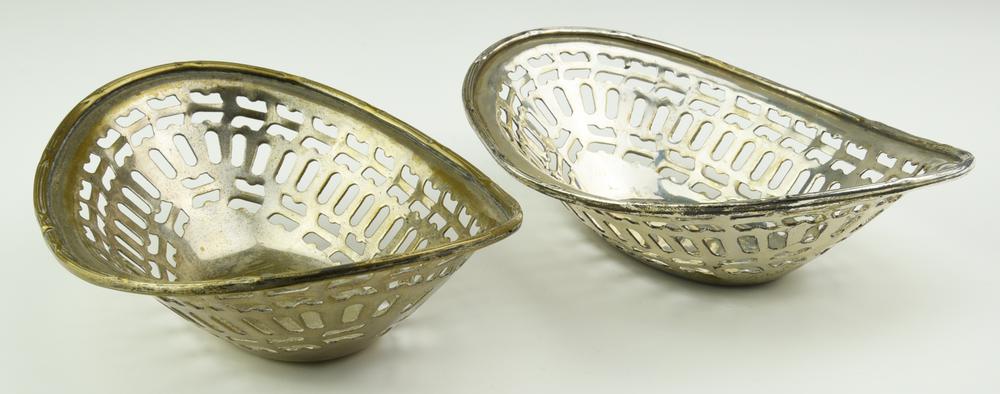 COPPIA DI PICCOLI CESTINI in Sheffield con decorazione traforata e incisa cm...