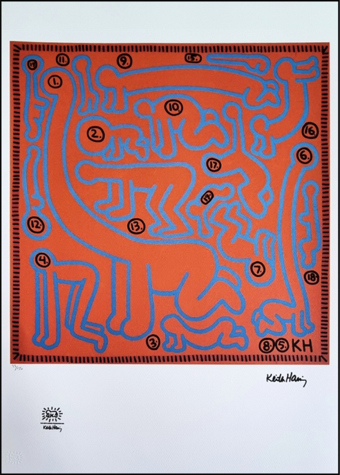 HARING KEITH Pennsylvania 1958 - New York 1990 "Senza titolo" Riproduzione litografica offset cm 50x70. Firma in stampa sul fronte in basso a destra, tiratura, timbro a secco e timbro in stampa a sinistra.