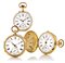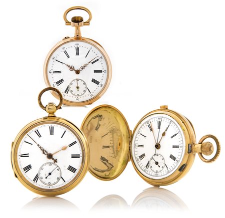 Casse in oro giallo 18 kt lisce, una incisa a motivi floreali. Quadranti in smalto con numeri romani e secondi al 6. Movimenti con scappamento ad ancora, uno con carica a chiavetta.