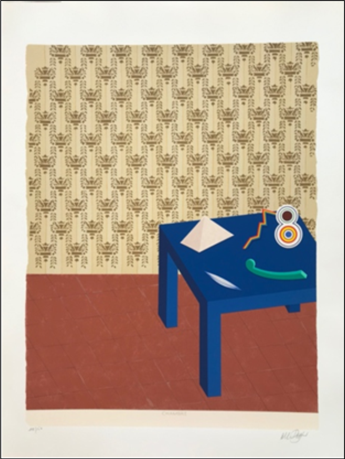 DEL PEZZO LUCIO Napoli 1933 - Milano 2020 "Chambre" Litografia con applicazioni di collage cm 55,5x75. Firmata sul fronte in basso a destra, intitolata al centro, tiratura a sinistra.