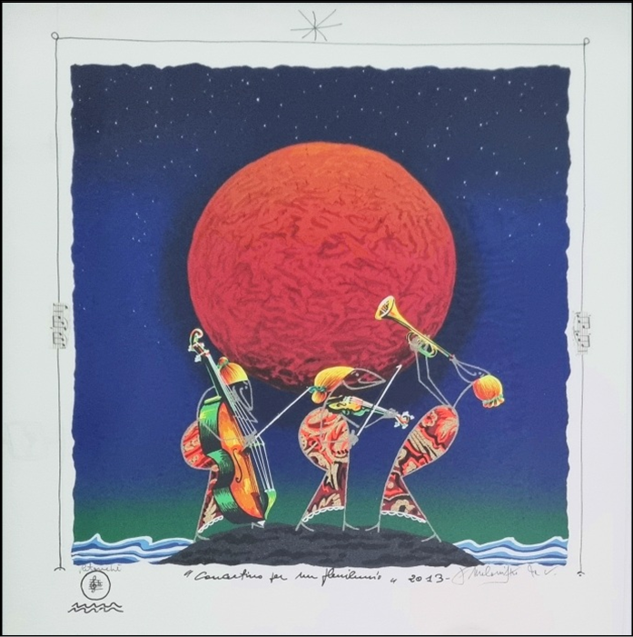 MELONISKI Villacidro 1943 "Concertino per un plenilunio" Retouchè materica su carta cm 50x50 del 2013. Firmata e datata sul fronte in basso a destra, intitolata al centro, tecnica e timbro a secco a sinistra.