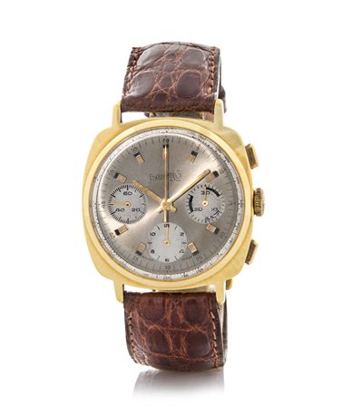 Cassa massiccia n. 29501-206 carré galbé in oro giallo 18 kt con pulsanti rettangolari. Quadrante bicolore grigio e argentato con indici applicati, contatore a 30 minuti e 12 ore, scala tachimetrica periferica. Movimento a carica manuale. Quadrante, cassa e movimento firmati.