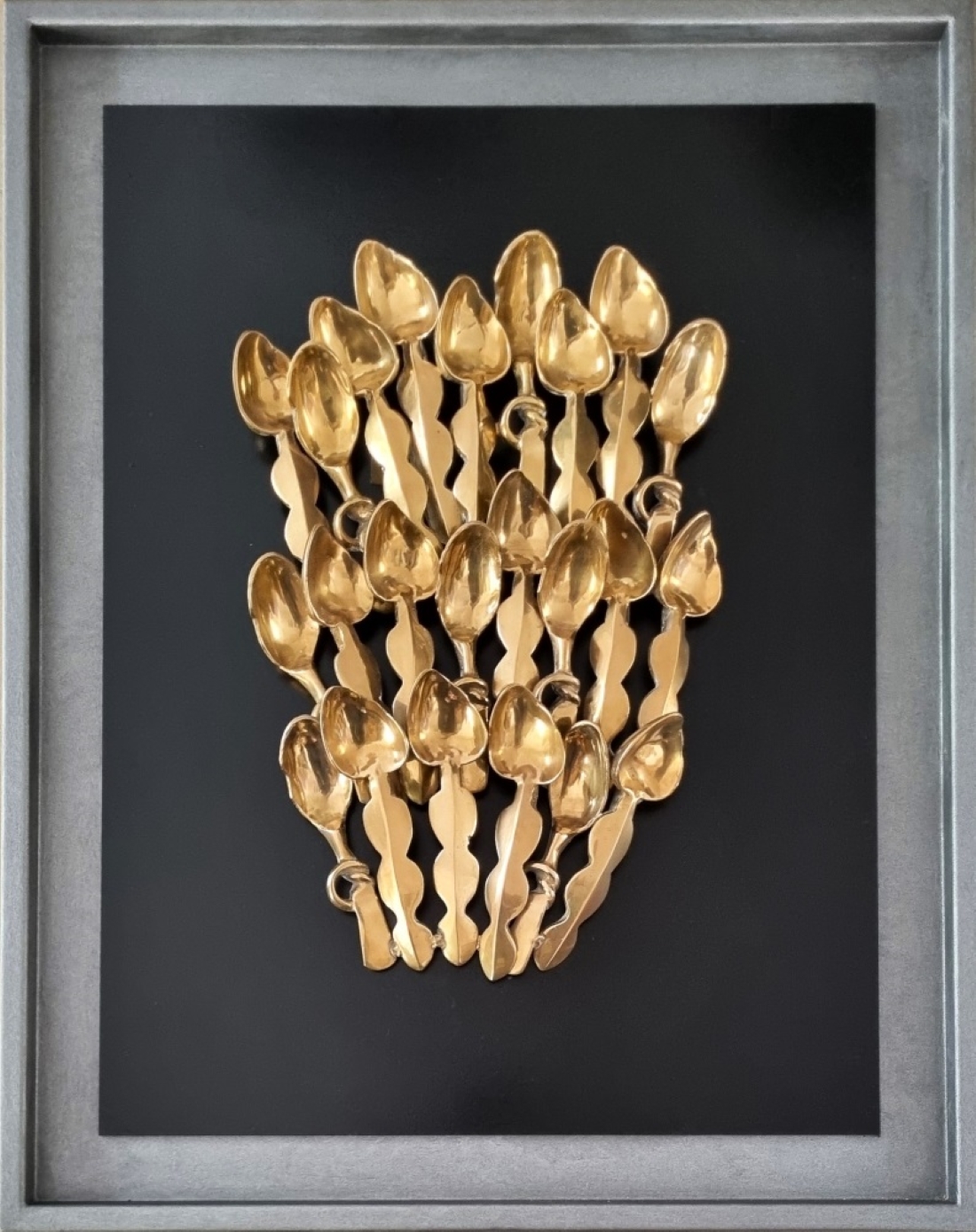 FERNANDEZ ARMAN Nizza 1928 - New York 2005 "Cuilleres africani" Assemblaggio di cucchiai in bronzo patinato cm 38x58, applicati su tavola cm 61x82, del 1999. Firma e tiratura E.A. 8/15 incise sul primo cucchiaio in basso a destra. Certificato di autenticità e garanzia a cura di Cudemo Editore, certificato di garanzia a cura di "Istituto diffusione arte".