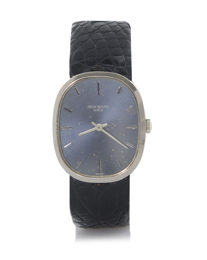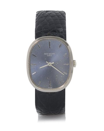 Cassa n. 2697848 ellittica in oro bianco 18 kt con anse centrali. Quadrante in oro blu con indici applicati. Movimento n. 1155609 a carica manuale. Quadrante, cassa e movimento firmati.