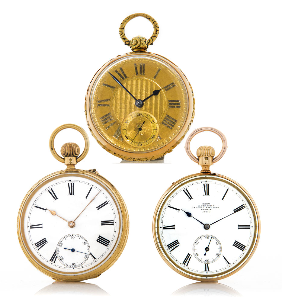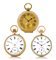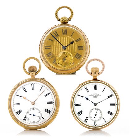 Casse in oro giallo 18 kt, due finemente incise ed una liscia con monogramma. Quadranti con numeri romani e secondi al 6, due in smalto ed uno in oro. Movimenti con scappamento ad ancora, carica manuale.