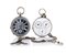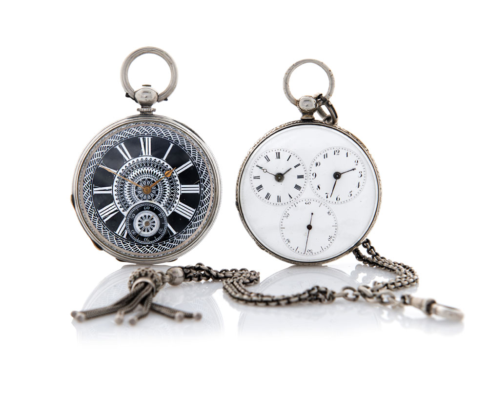 Casse in argento. Un quadrante in smalto con doppio fuso orario composto da due piccoli quadranti e secondi al 6, uno in smalto nero e bianco con numeri romani, secondi al 6 e ricchi decori. Movimenti con scappamento ad ancora ed uno a cilindro, carica a chiavetta. Uno completo di catenella.