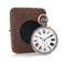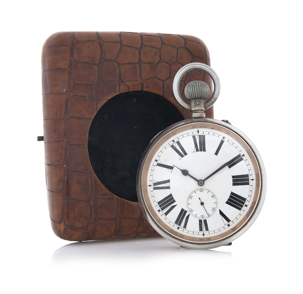 Cassa in metallo liscia. Quadrante in smalto con numeri romani e secondi al 6. Movimento con scappamento ad ancora, chiuso per 3/4, carica manuale. Completo di custodia da viaggio ed appoggio in coccodrillo marrone.