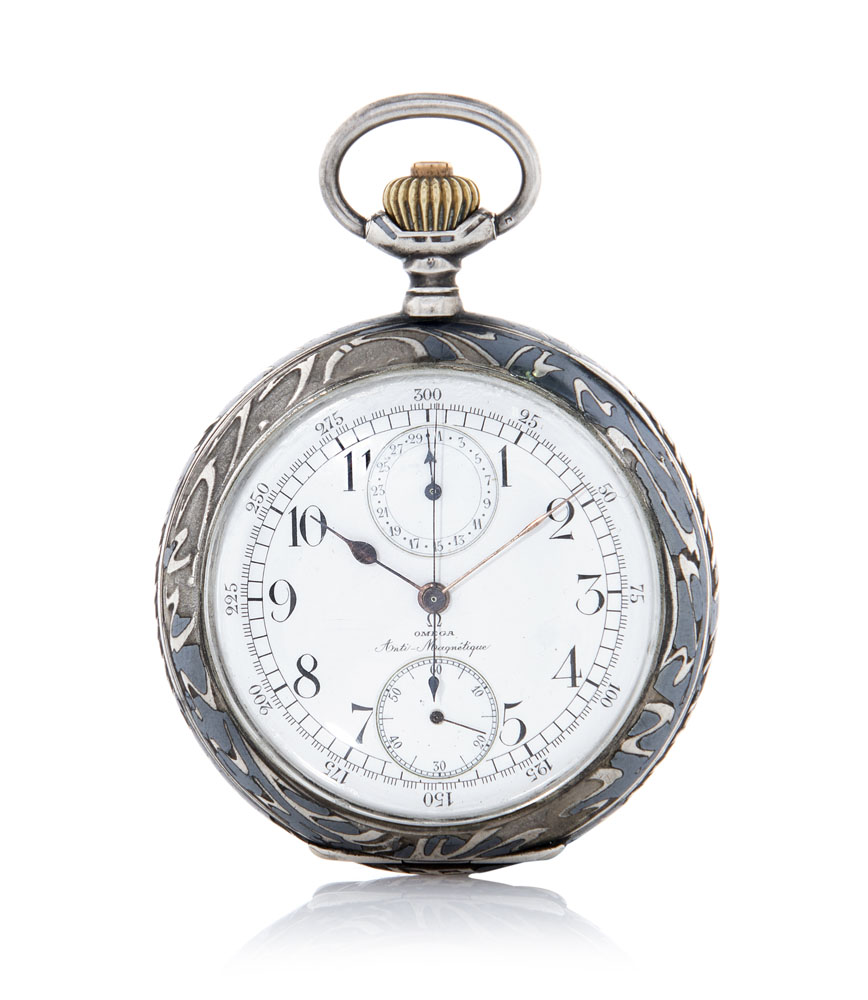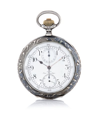 Cassa n. 3237579 in argento e niello con decoro a volute fogliacee. Quadrante in smalto con numeri arabi, secondi al 6 e contatore a 30 minuti al 12. Movimento con scappamento ad ancora, carica manuale. Quadrante e cassa firmati.