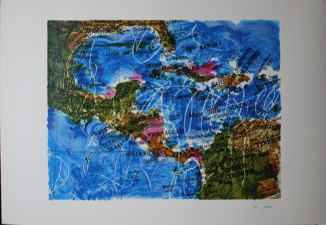 MARIO SCHIFANO, "Veduta (cartina)", Serigrafia materica a smalto su carta, Dim. 70x100, Al fronte: tiratura 152/199 in basso a sinistra, firmato in basso a destra. Presenta piccolo difetto in basso a sinistar sulla carta.