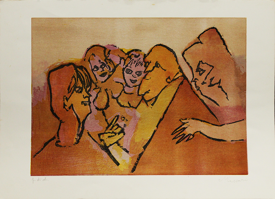 MINO MACCARI, "Quattro donne e un uomo", litografia su cartoncino, prova d'autore, dim 50x70. Al fronte: Prova d'Autore in basso a sinistra e firma in basso a destra.