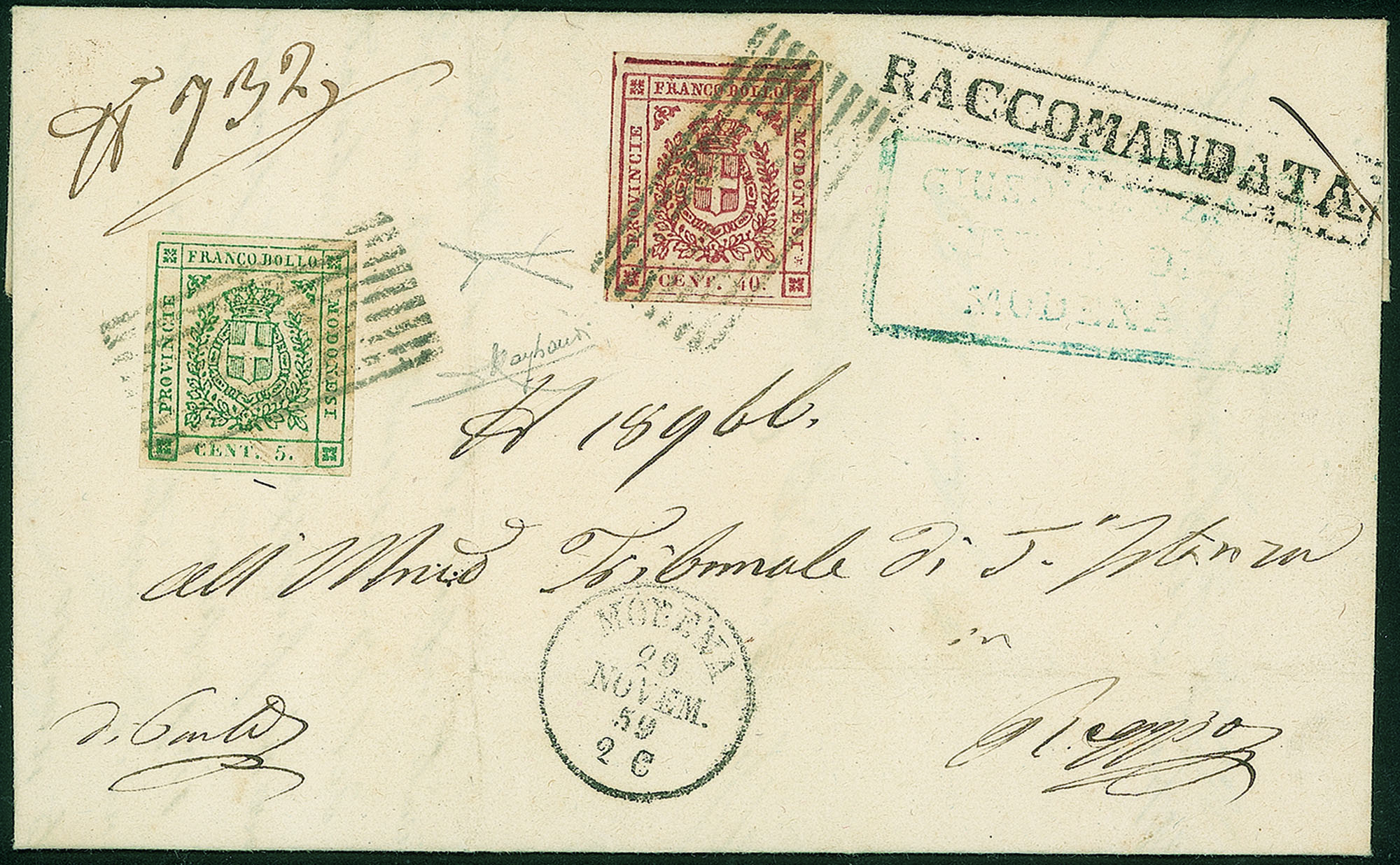 Antichi Stati Italiani - Modena - Raccomandata da Modena a Reggio affrancata con 1 es. 5 cent. verde + 40 cent. carminio