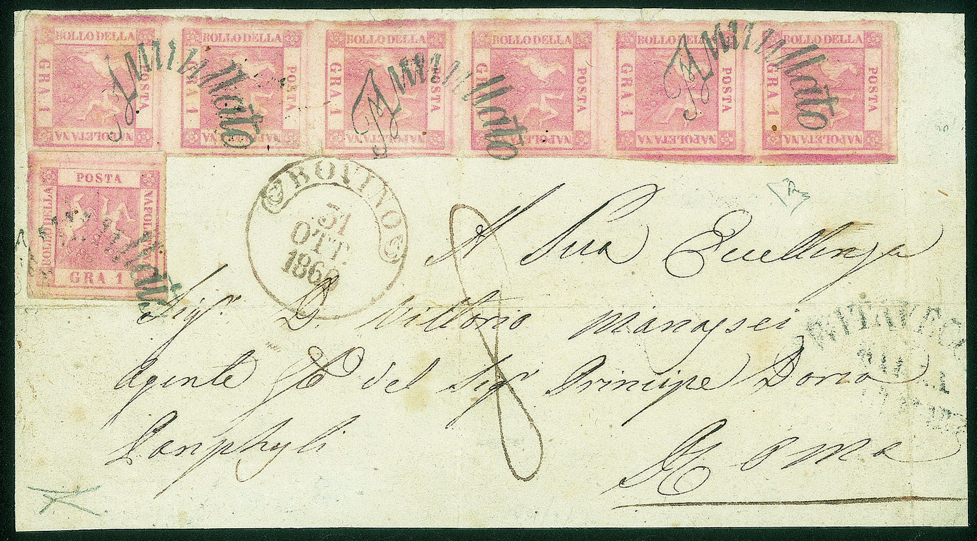 Antichi Stati Italiani - Napoli - Lettera affrancata con striscia verticale di sei + singolo del gr.1 rosa carminioSeconda tavola (4) annullati con bollo a svolazzo e sulla soprascritto il cerchio in rosso di BOVINO 31 OTT.18660, diretta a Roma con tassa 8 per l'inoltro a destino, cert. E.Diena