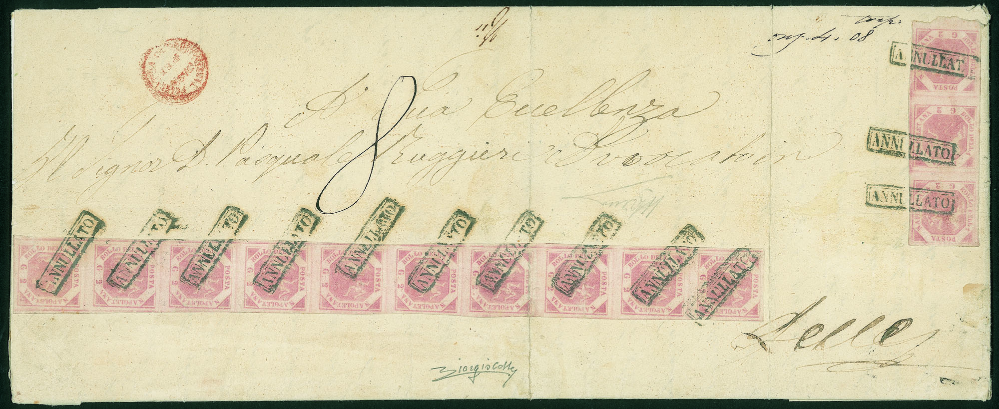 Lot 38 | Antichi Stati Italiani - Napoli - Plico affrancato con striscia verticale di tre del 2 grana rosa chiaro (7b)