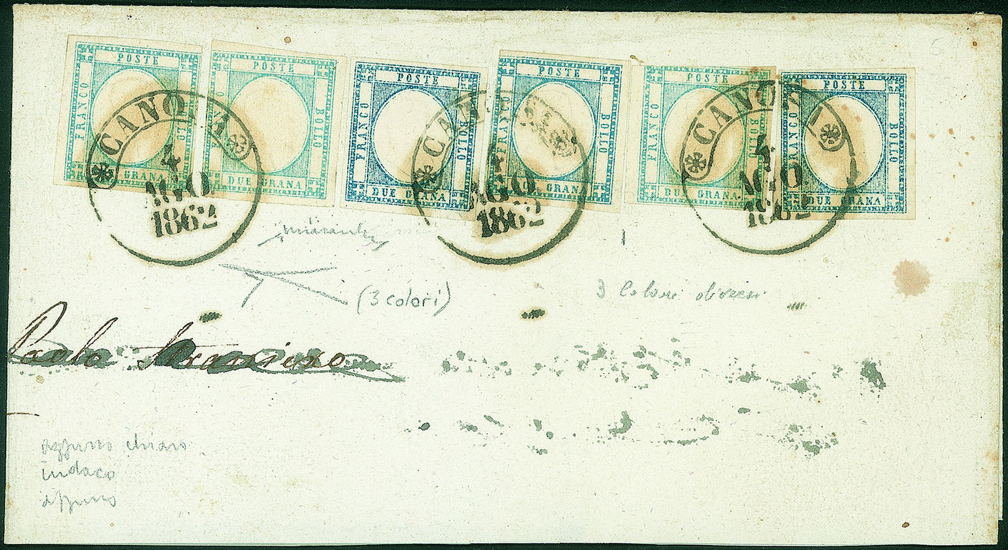 Antichi Stati Italiani - Napoli - Sei esemplari del 2 grana di colori differentiTre in gradazione celeste uno azzurro due indaco chiaro (20a+20b+20e) - lievi difetti di marginatura in alcuni francobolli - su testata di grande involucro di plico da Canosa 4 AGO.1862 - eccezionale - cert. Bottacchi