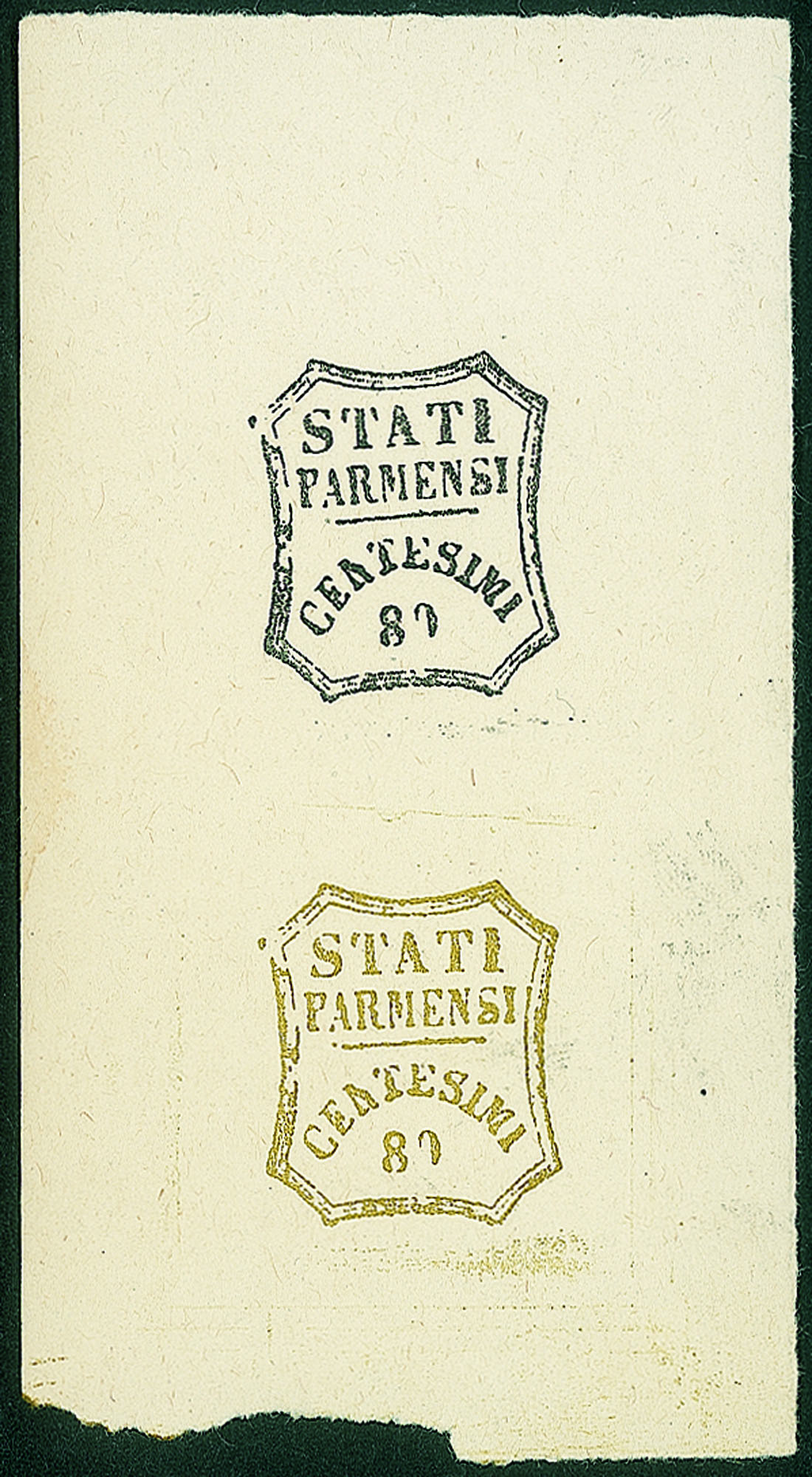 Antichi Stati Italiani - Parma - Falso Desperatic.80 in nero e c.80 bistro oliva su carta bianca con riquadro di clichè sui quattro lati per entrambi