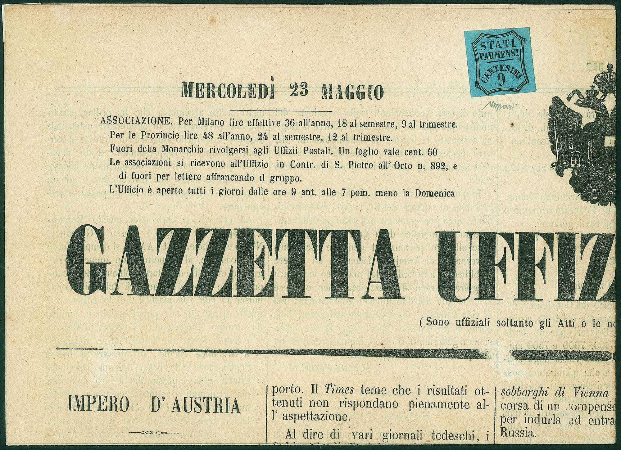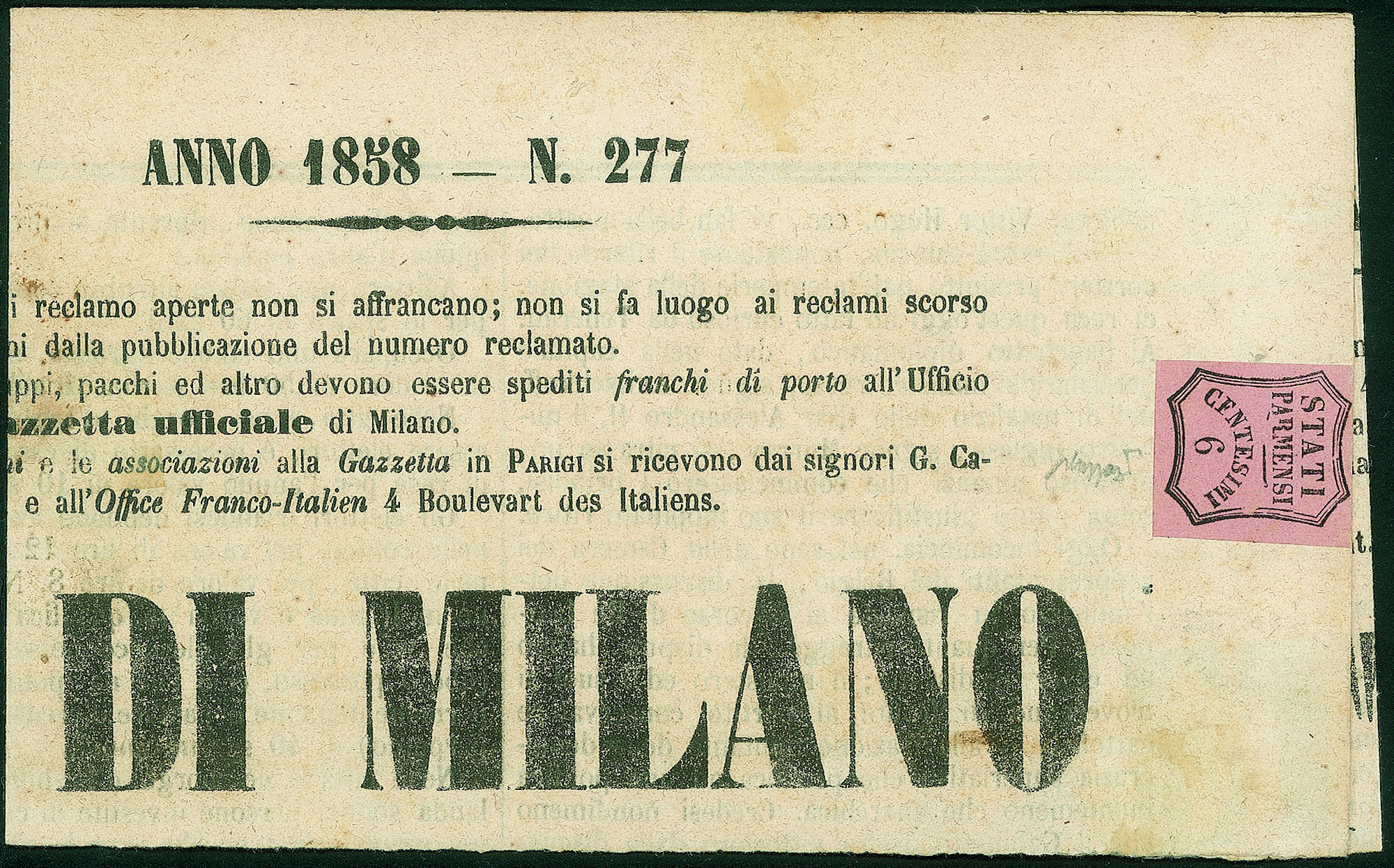 Antichi Stati Italiani - Parma - Insieme di due giornali con SEGNATASSE per Gazzette estereNei valori da c.6 rosa e c.9 azzurro, non annullati, entrambi cert. Caffaz