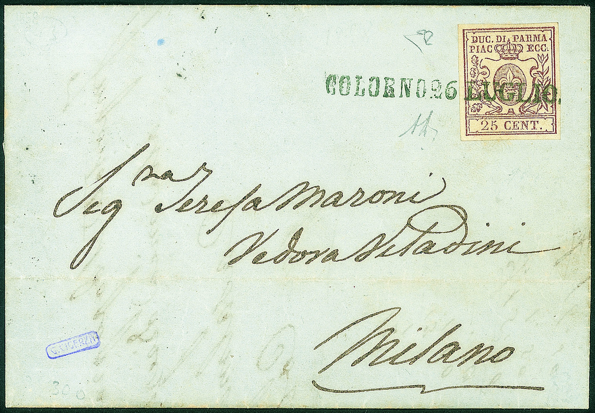 Antichi Stati Italiani - Parma - Lettera con c.25 bruno rosso con lineare su una rigaIn nero azzurrastro, COLORNO 26 LUGLIO del 1858 per Milano, cert. E.Diena
