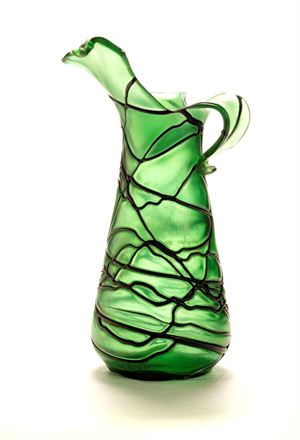 PALME - KOENIG E HABEL 1889 - 1920 Vaso tronconico in vetro verde a decoro di filetti neri applicati a caldo, imboccatura a fiore con risvolto ad ansa lavorato a caldo alla pinza. Epoca 1900 ca. H 31 cm
