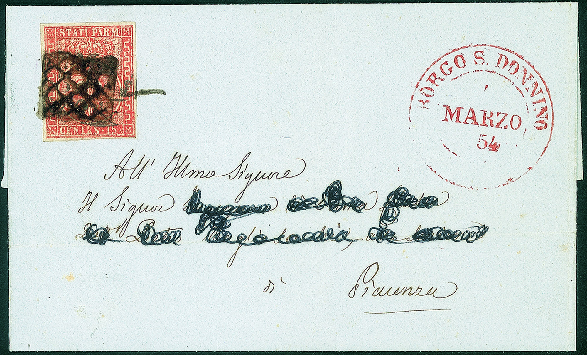 Antichi Stati Italiani - Parma - Lettera con c.15 vermiglioCon annullo a griglietta + d.c. rosso BORGO S.DONNINO 4 MARZO 1854 per Piacenza, annullo a griglia molto inchiostrato