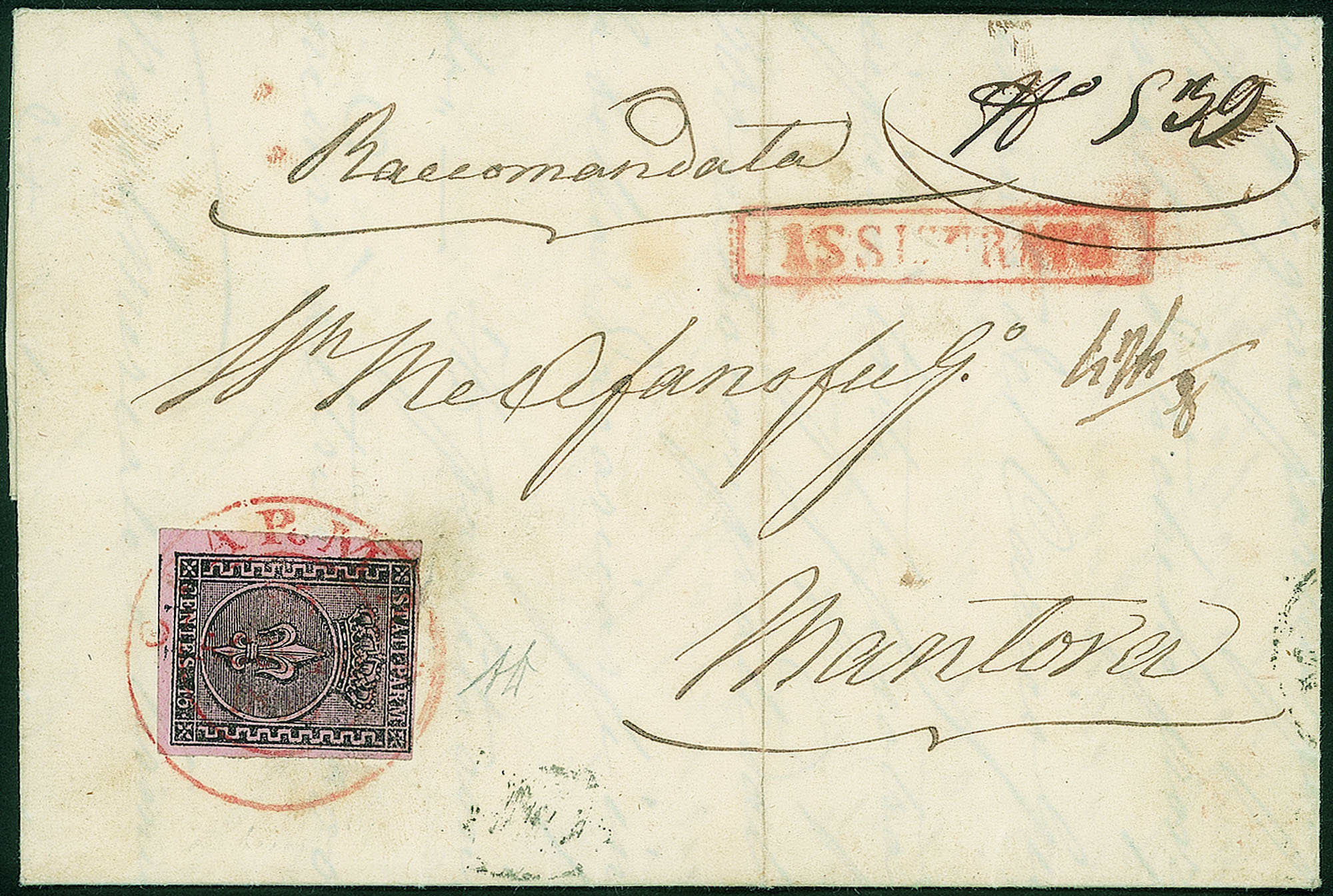 Antichi Stati Italiani - Parma - Lettera assicurata con c.15 rosa con ampi marginiAnnullo d.c. rosso PARMA + lineare in cartella rossa ASSICURATO, al verso c.25 rosso bruno diretta a Mantova, al verso il bollo in cartella ARR.TA DI NOTTE
