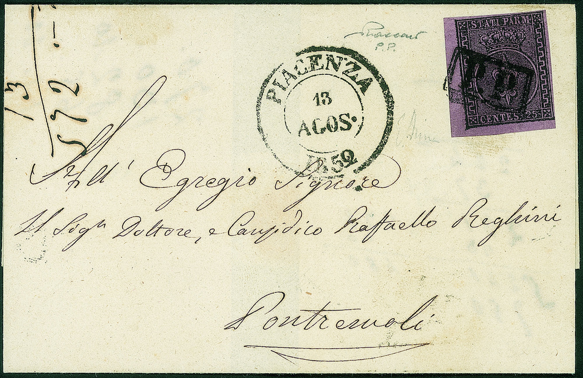 Antichi Stati Italiani - Parma - Lettera con c.25 violettoAngolo di foglio, da PIACENZA 13 AGOS.1852 per Pontremoli con annullo P.P. in cartella sul francobollo (P.ti 10), cert. P.Vaccari