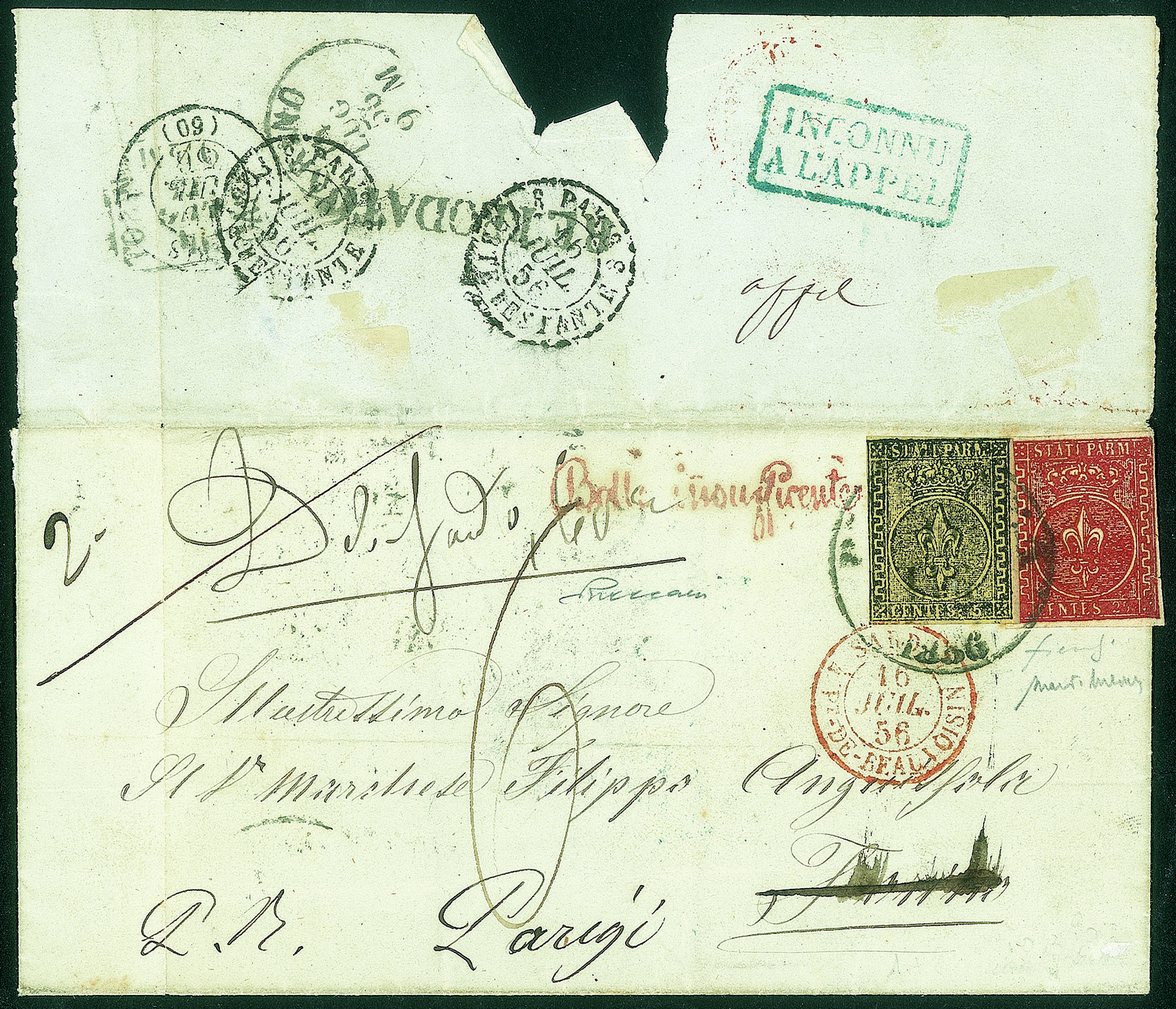 Antichi Stati Italiani - Parma - Lettera doppio porto con c.5 + c.25 (1b+8)Da PIACENZA 12 LUG.56 per Torino, Bollo Insufficiente corsivo rosso e segno di tassa 6 decimi apposto a Torino, qui rispedita a Parigi e manoscritto 'Debito Sardo 6', a Parigi il destinatario risulta irreperibile e viene apposto il bollo in cartella azzurro INCONNU A L'APPEL e quindi depositata al fermo posta con bollo PARIS POSTA RESTANTE 16 JUIL.56, - rara - Cert. M.Merone e P.Vaccari