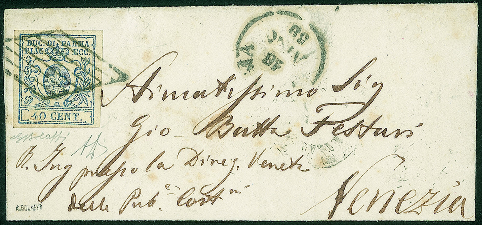 Antichi Stati Italiani - Parma - Lettera per il Lombardo VenetoIn tariffa di primo porto per la terza distanza con c.40 azzurro da PARMA 10 AGO.58 per Venezia