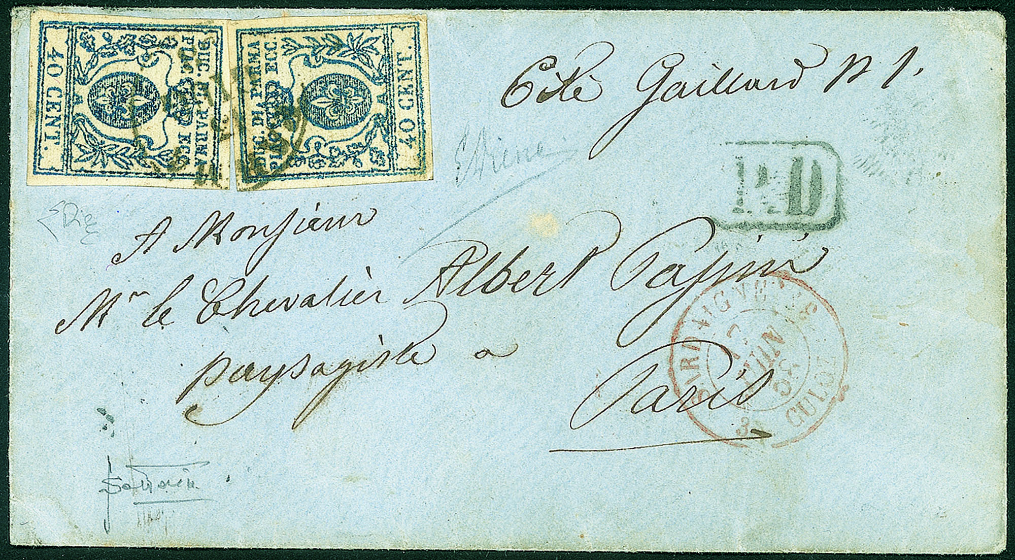 Antichi Stati Italiani - Parma - Lettera per la Francia con due esemplari c.40 azzurroTerza emissione da PARMA 13 GIUG.58 per Parigi con bollo PD in cartella e bollo dell'ufficio di scambio di Culoz, cert. E.Diena