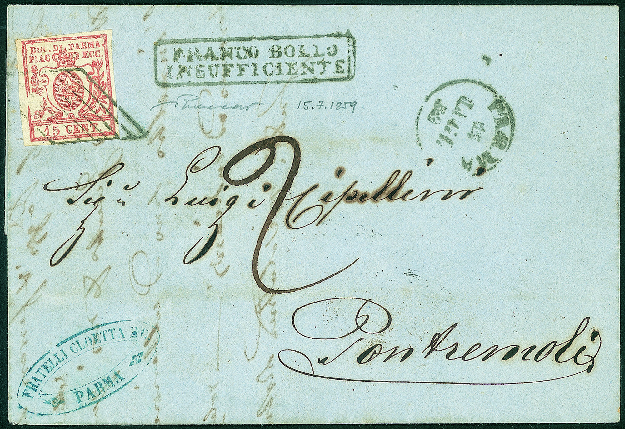 Antichi Stati Italiani - Parma - Lettera con c.15 vermiglio annullo a losanga di PARMA 15 LUG.59Per Pontremoli, nel primo giorno di applicazione delle tariffe sarde, la missiva che avrebbe dovuto pagare 20 centesimi secondo le nuove tariffe sarde è stata tassata e applicato il bollo in cartella FRANCOBOLLO INSUFFICIENTE, secondo periodo del Governo Provvisorio, cert. P.Vaccari