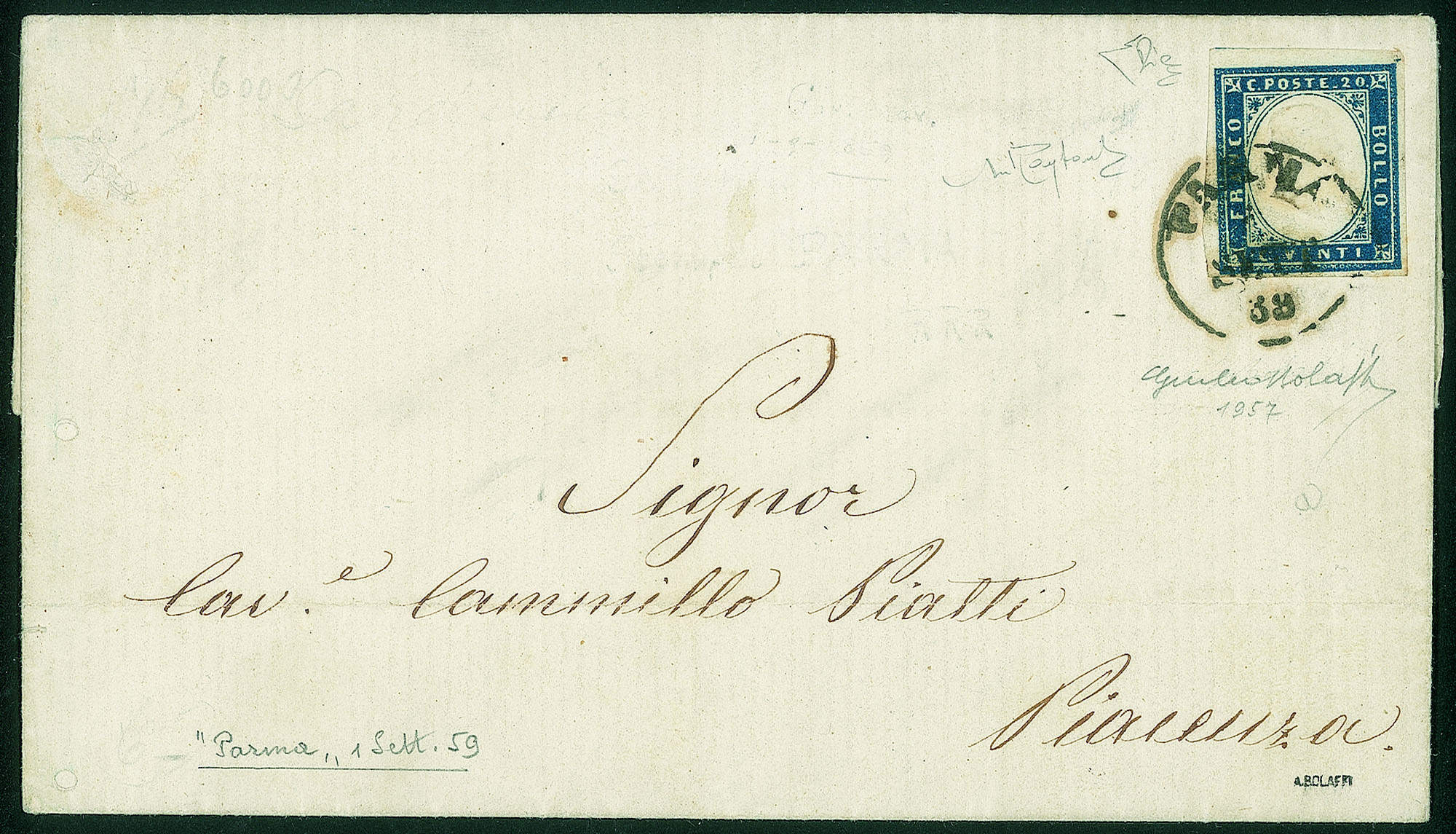 Antichi Stati Italiani - Parma - Lettera con Sardegna c.20 azzurro scuroAnnullato 1 SET.59 per Piacenza, secondo periodo di Governo Provvisorio, cert. G. Bolaffi, Raybaudi, E. Diena