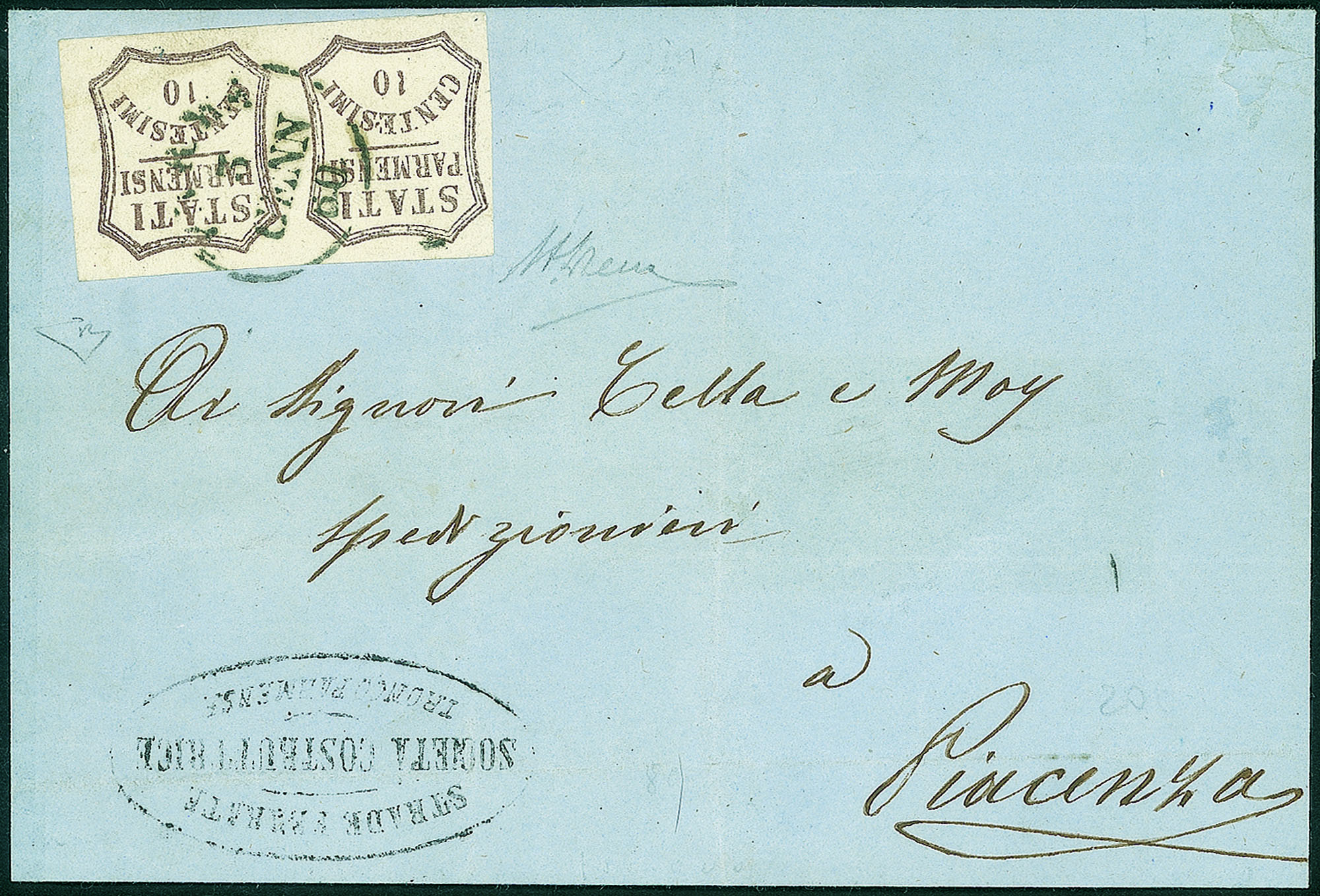 Antichi Stati Italiani - Parma - Lettera con coppia c.10 brunoPosizioni 17 e 18 dell seconda composizione da PARMA 3 GENN.60 per Piacenza, cert. E.Diena