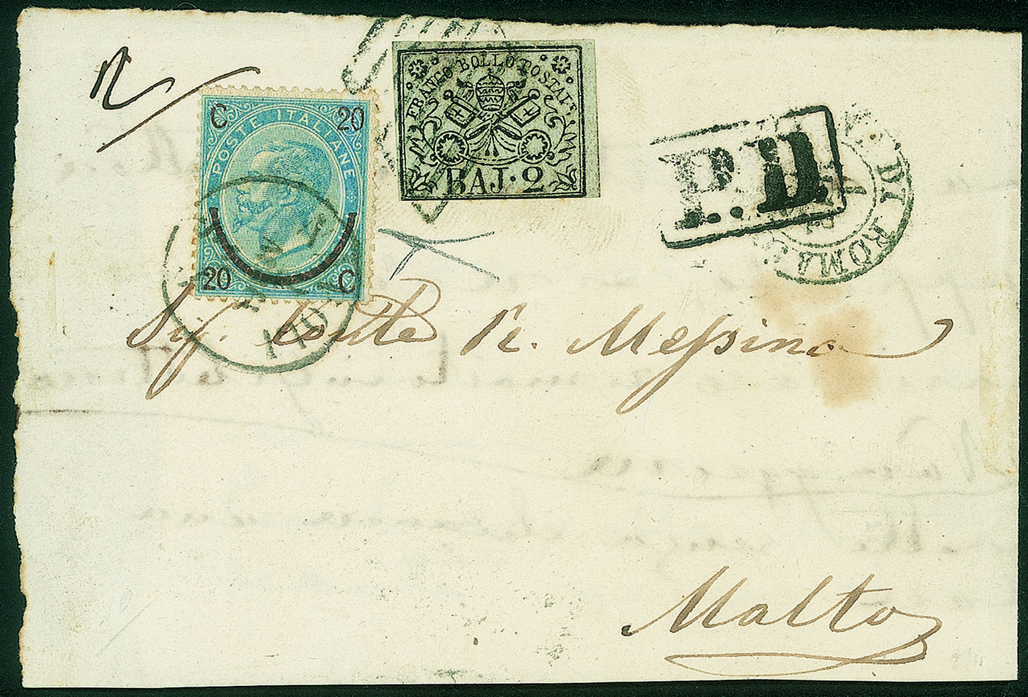 Annullato mediante bollo muto a losanga pontificia di Roma, a lato il bollo d.c. DIREZIONE DI ROMA 1 MAR.65 + Regno d'Italia c.20/15 celeste I° tipo (23a) annullato in transito con datario c.s./ore NAPOLI 2 MAR.65 su fascetta per stampati diretta a Malta, affrancato in tariffa di doppio porto per stampati diretti a Malta, grande rarità, cert. G.Bottacchi