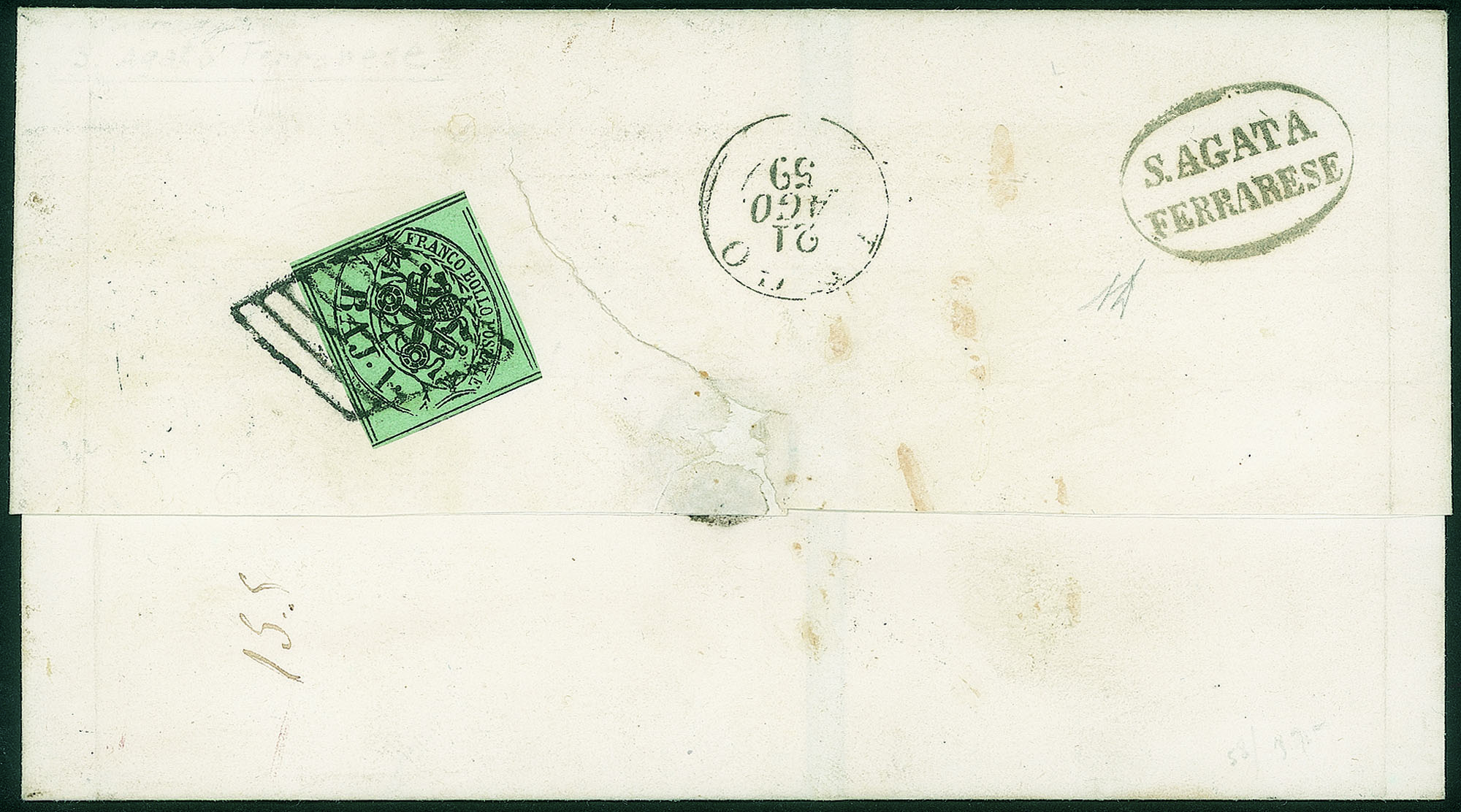 Antichi Stati Italiani - Romagne - Governo Provvisorio - 1 baj (2)Al retro di lettera con a lato S. Agata Ferrarese in ovale (P.ti R3) - Ferrara 20.8.59 - molto rara - Diena