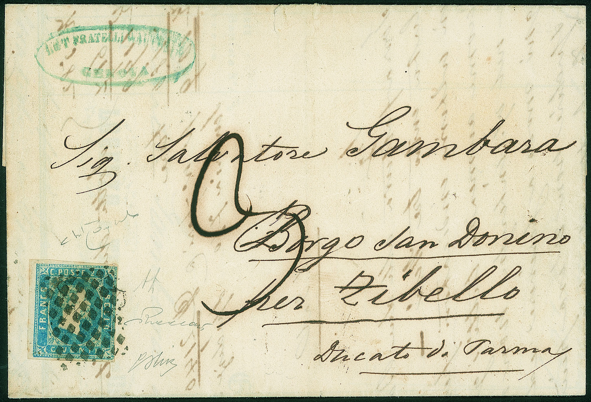 Antichi Stati Italiani - Sardegna - Lettera da Genova del 10 novembre 1852Affrancata con c.20 azzurro (2) di Sardegna e diretta a Zibello con segno di tassa 3 decimi in periodo preconvenzione, firma Vaccari cert. Raybaudi