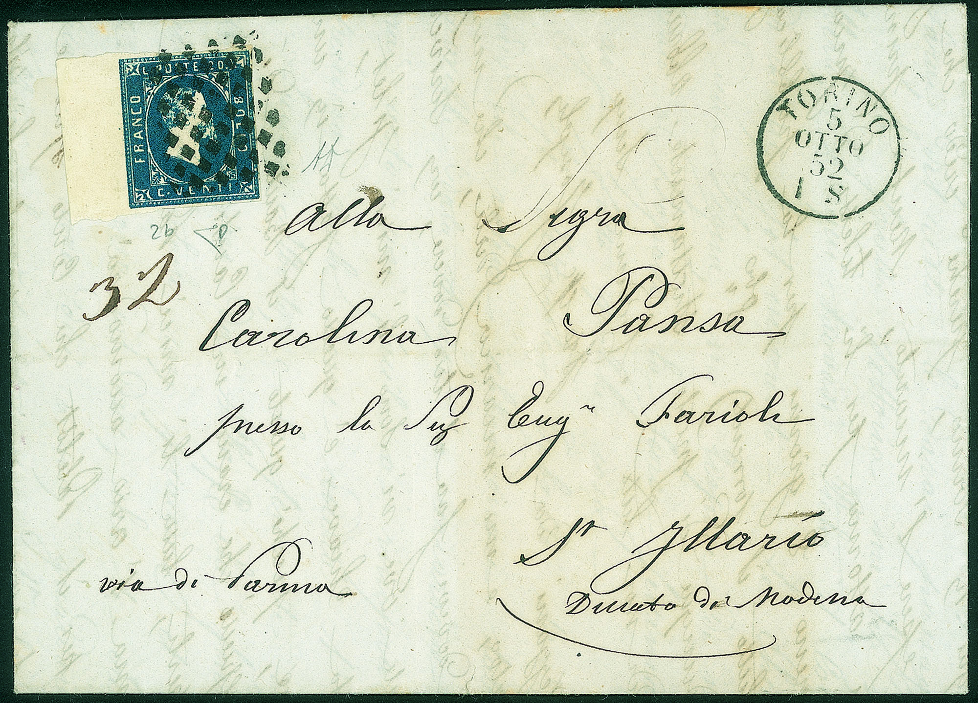 Antichi Stati Italiani - Sardegna - Lettera affrancata con 20 cent (2b)