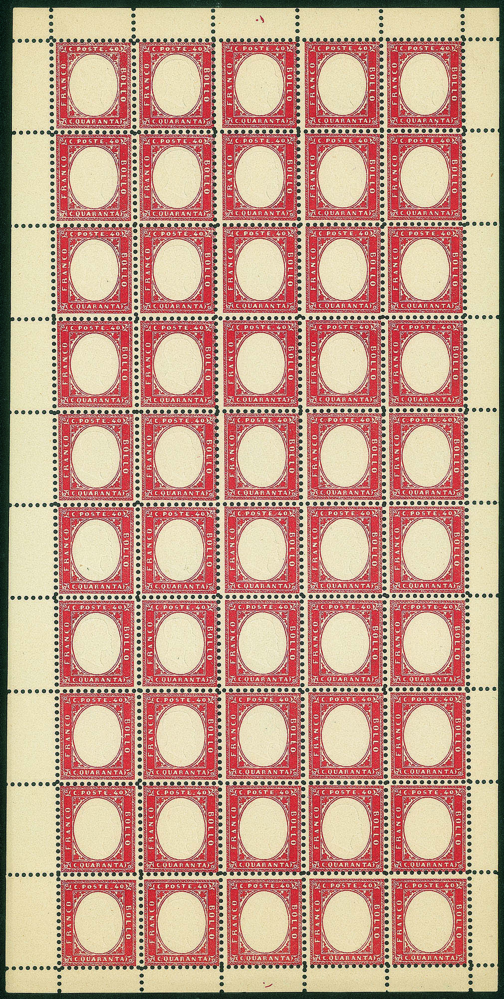Antichi Stati Italiani - Sardegna - 1855/1863 - Ristampe (Usigli) - 5 cent 20 cent e 40 cent (13 + 15/16)In fogli di 50 con perforazioni - completi di bordi - nuovi