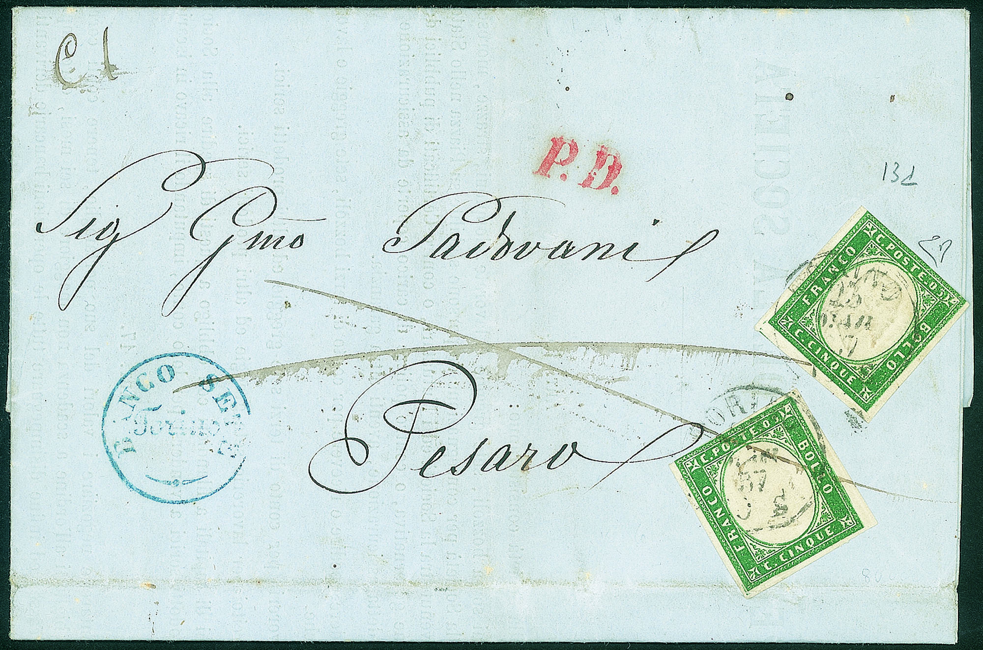 Antichi Stati Italiani - Sardegna - Circolare con due esemplari c.5 verde smeraldo (!3g)Da TORINO 23 MAR.57 per Pesaro, estremamente rara