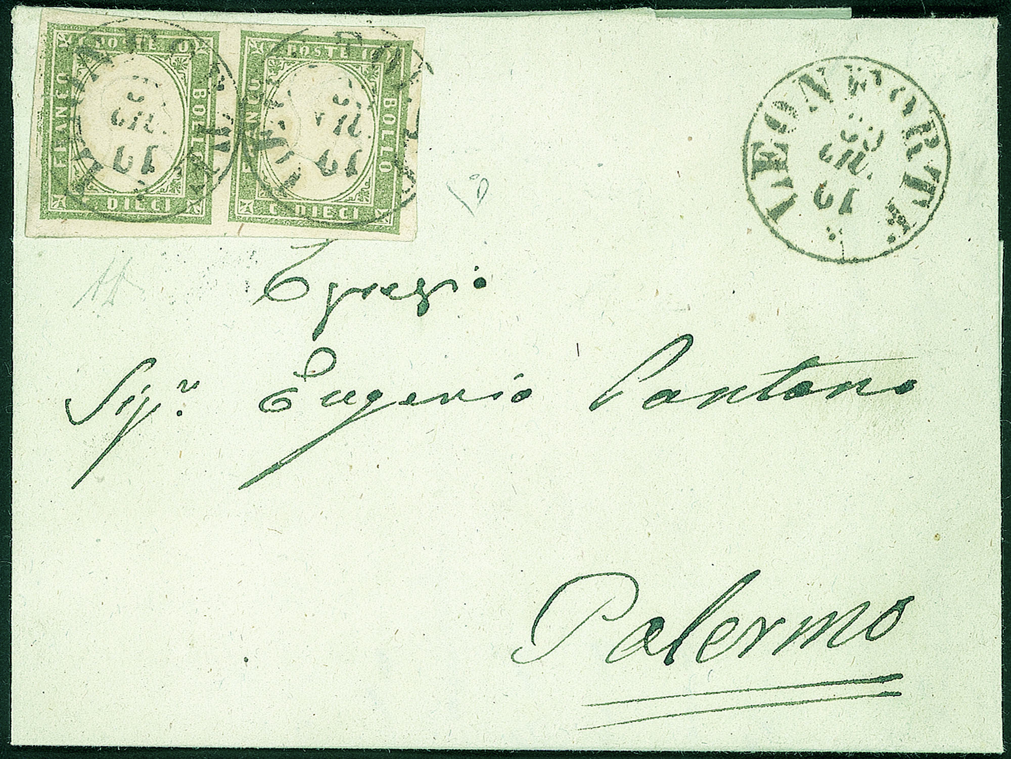 Antichi Stati Italiani - Sardegna - Lettera da LEONFORTE 19 GIU.62 con coppia c.10 oliva grigio verdastro (14Caa)Diretta a Palermo