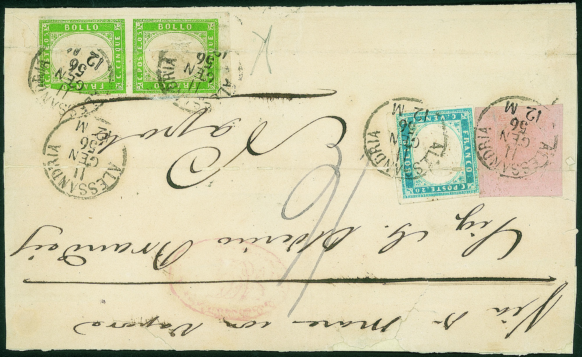 Antichi Stati Italiani - Sardegna - Rara affrancatura mista impreziosita dalla coppia del c.5 verde gialloViaggiata coi Piroscafi Postali Francesi in tariffa da 70 centesimi per Napoli e affrancata con seconda emissione c.40 rosa+ IV emissione c.20 cobalto + coppia c.5 verde giallo (6a+ 13a + 15) da ALESSANDRIA 11 GEN.56, nonostante i difetti insieme molto raro e fresco, cert. G.Bottacchi