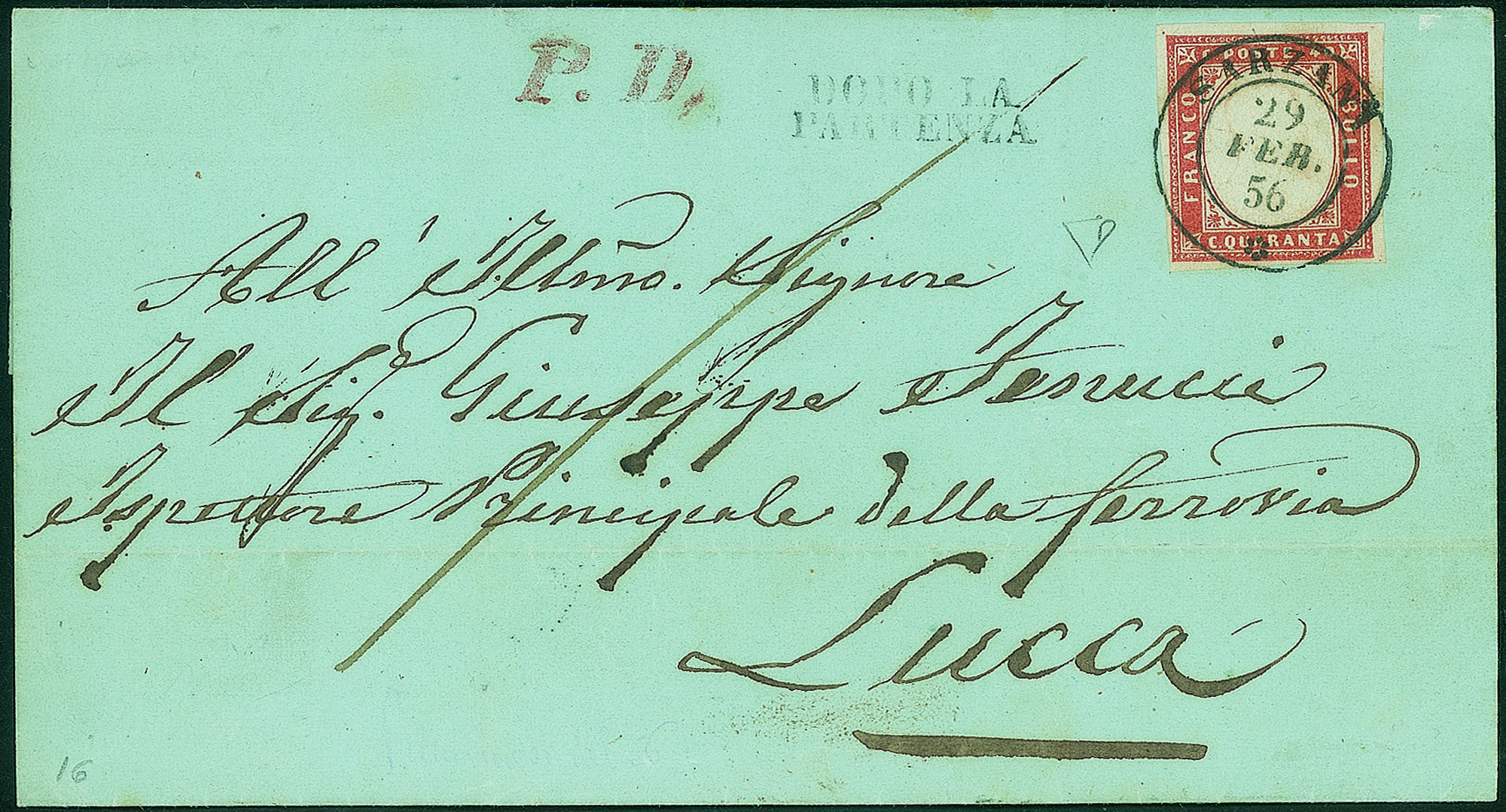 Antichi Stati Italiani - Sardegna - Lettera con c.40 vermiglio da SARZANA 29 FEB.56Per Lucca con a lato il bollo P.D. in rosso + lineare DOPO LA PARTENZA, cert. E.Diena