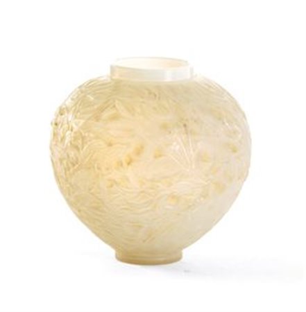 LALIQUE RENE' Ay 1860 - 1945 Parigi Vaso "Gui" ovoidale in vetro bianco opalescente e patinato, decoro di vischio e foglie in rilievo. Modello creato dal maestro nel 1920, figura nel catalogo del 1932 e non più ripreso dal catalogo del 1937. H 17 cm Firma impressa a bastoncino "R. Lalique" Bibl.: Catalogue Raisonneé Felix Marcilhac, n° Vase "Gui" oval white opal glass and patinated, and leaves of mistletoe decoration in relief. Model created by the master in 1920, the figure of 1932 in the catalog and no longer taken from the catalog of 1937.