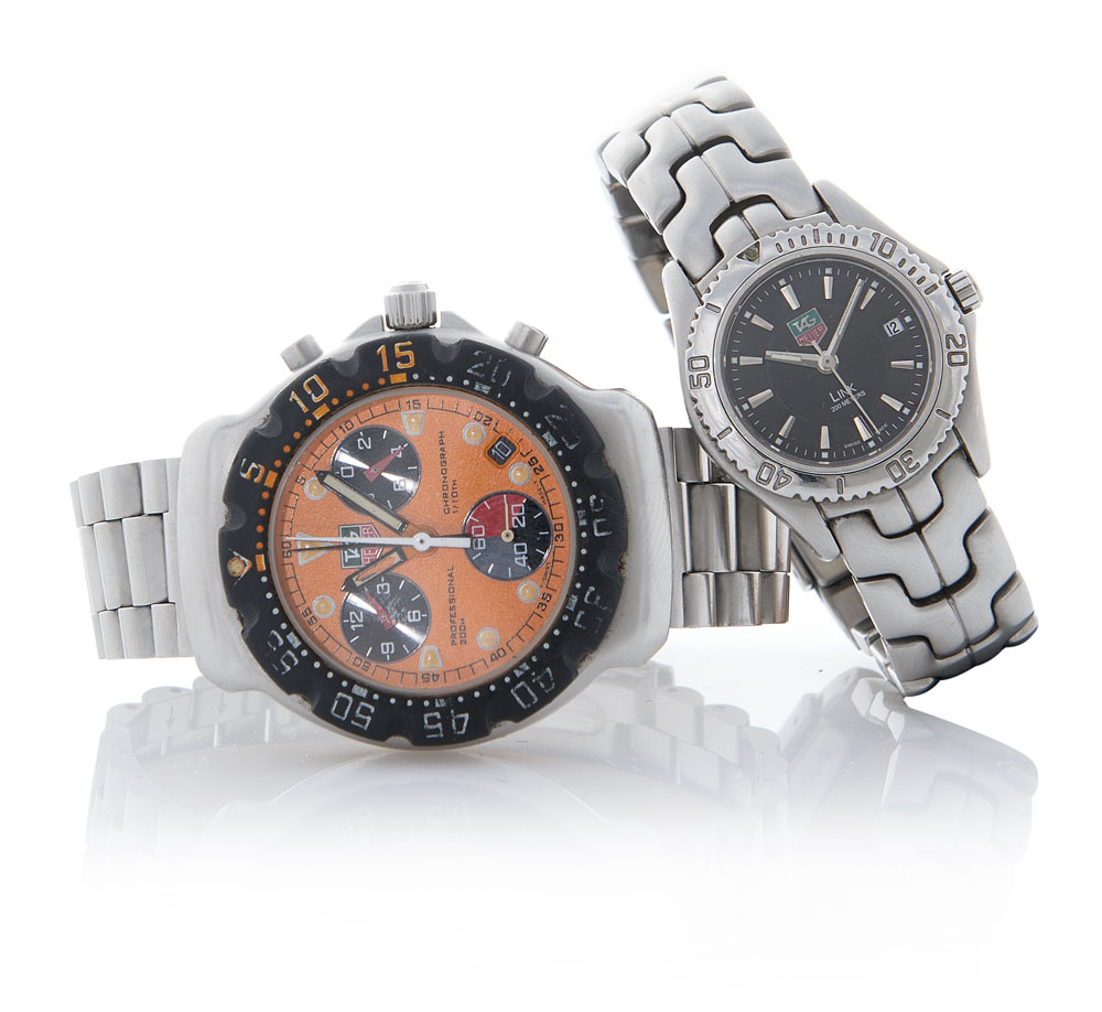 1. Cassa in acciaio con pulsanti tondi, fondello e corona a vite, lunetta nera graduata e girevole, vetro zaffiro. Quadrante bicolore arancione e nero con indici e lancette luminescenti, data tra il 4/5. Movimento al quarzo. 2. Cassa in acciaio con fondello a vite, lunetta graduata e girevole, vetro zaffiro. Quadrante nero con indici applicati, lancette luminescenti, secondi al centro e data al 3. Movimento al quarzo. Bracciali in acciaio. Quadranti, casse e movimenti firmati.